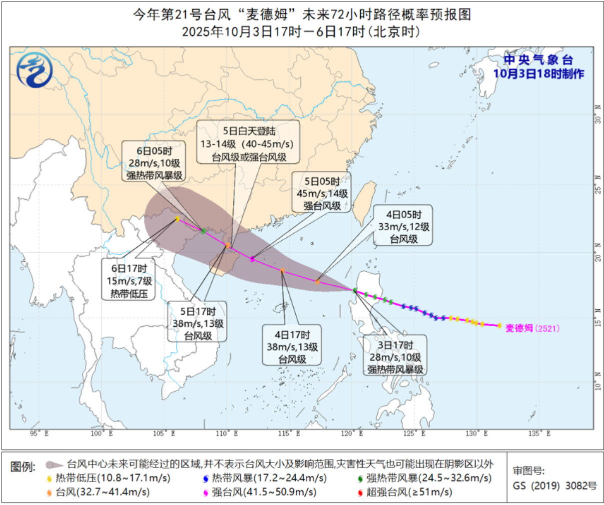 在菲律宾当地时间10月3日,“麦德姆”已在菲律宾吕宋岛登陆。截至3日17时,“麦德姆”已穿过吕宋岛,位于吕宋岛西北部近海的海面上,强度为强热带风暴级。